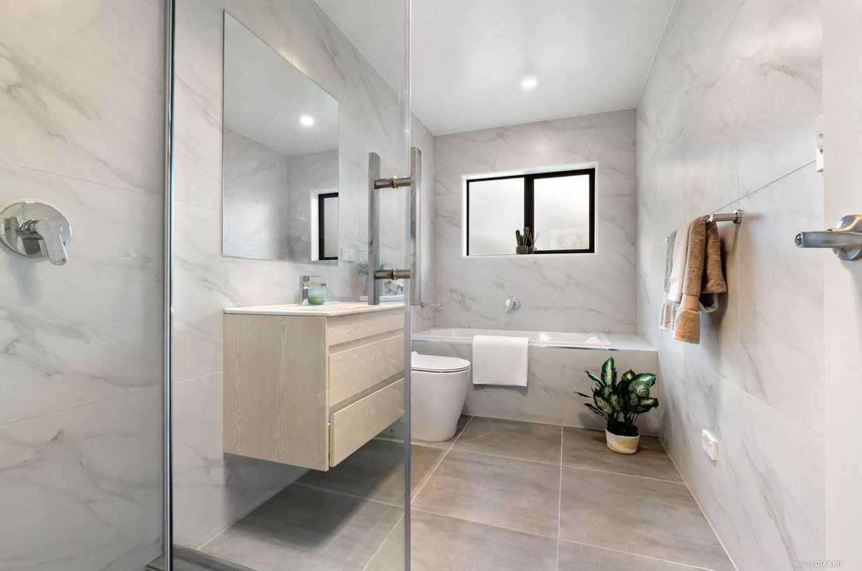 The kitchen has been designed with both form and function in mind. It features acrylic cabinetry, a stone benchtop, designer splashback, and modern appliances, making it a space that is both visually appealing and highly functional for daily cooking and entertaining. In the bathroom, attention to detail is evident in the full-height tiled walls, sleek vanity, modern fixtures, and a spacious glass shower. The clean lines and soft finishes create a calming and practical space for the whole family.